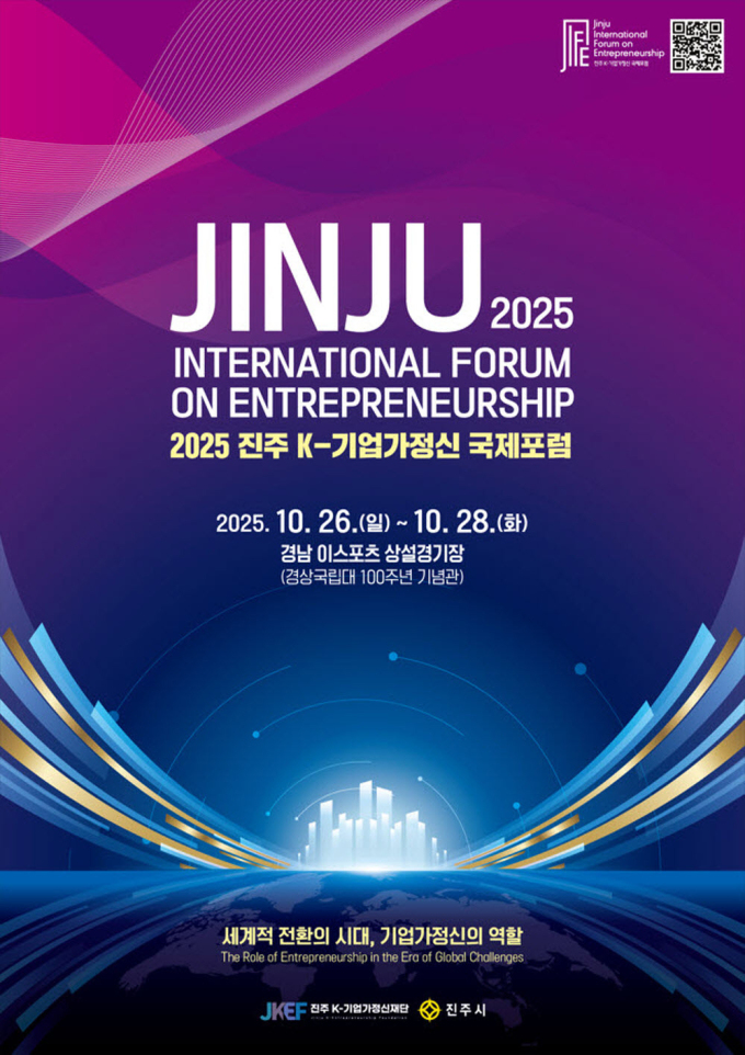 경남 진주시와 진주 K-기업가정신재단은 오는 26일부터 28일까지 경상국립대학교 100주년기념관 등 시 일원에서 '2025 진주 K-기업가정신 국제포럼'을 개최한다고 20일 밝혔다.