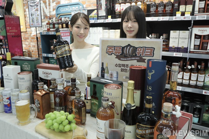 [서울=뉴스핌] 20일 오전 서울 이마트 용산점에서 모델들이 '주류위크' 할인 상품을 소개하고 있다. 이마트는 가을 나들이와 캠핑 시즌을 맞아 10월 29일(수)까지 인기 주류 대규모 할인행사인 ‘주류위크’를 진행한다. 이번 행사에서는 프리미엄 위스키부터 하이볼용 데일리 위스키, 수입맥주, 사케까지 폭넓은 인기 주류를 최대 60% 할인된 가격에 만나볼 수 있다. [사진=이마트] 2025.10.20 photo@newspim.com