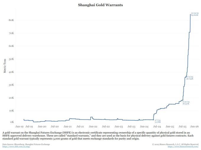 19일(현지시간) 비앙코리서치에 따르면 상하이선물거래소의 금 워런트 보유량은 84.606톤을 기록했다. 한 달 전의 약 2배, 연초 이후 25배인 수치다.