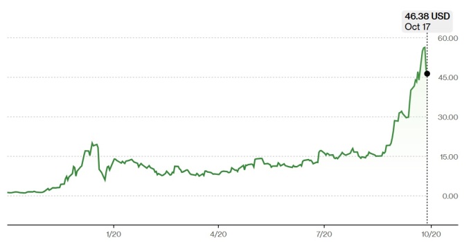 뉴욕증시에서 거래되는 업체의 주가는 10월17일 38.33달러에 거래를 종료해 연초 이후 약 300% 폭등했고, 1년 사이 3068% 치솟았다.