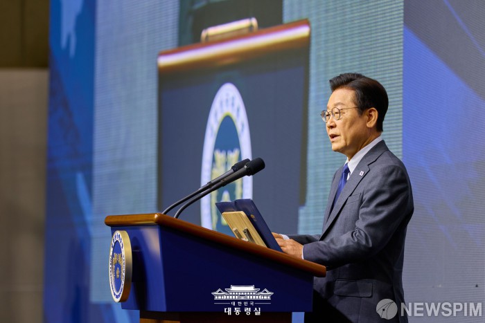 [서울=뉴스핌] 이재명 대통령이 20일 경기 고양시 일산서구 킨텍스에서 열린 서울 ADEX 2025(서울 국제 항공우주 및 방위산업 전시회 2025) 개막식에서 축사를 하고 있다. [사진=대통령실] 2025.10.20 photo@newspim.com |