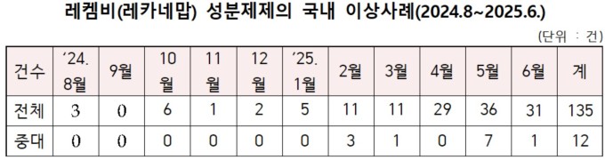 레켐비는 지난해 5월 24일 국내 허가 이후 8월부터 이상 사례가 보고됐다. 지난해 8월 3건이던 보고 건은 10월 6건, 11월 1건, 12월 2건으로 증감을 반복했다. 올해의 경우 1월 5건, 2월 11건, 3월 11건, 4월 29건, 5월 36건, 6월 31건이 추가돼 누적 135건에 이르렀다.
