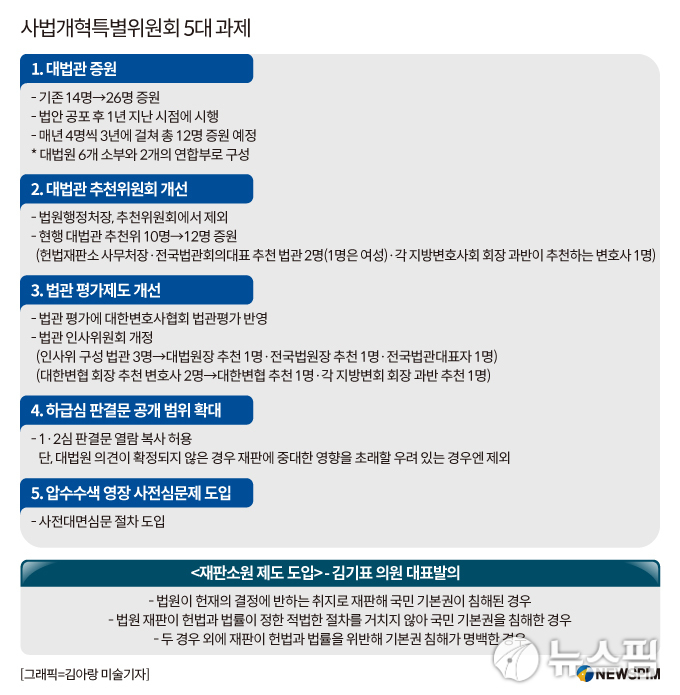 재판소원 제도 도입은 특위 위원인 김기표 의원이 대표 발의하고, 당 지도부도 발의에 참여하기로 했다.