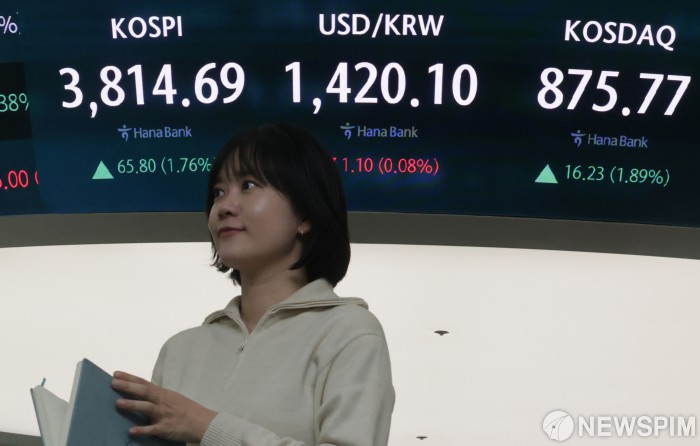 [서울=뉴스핌] 양윤모 기자 = 미중 무역 갈등 완화 기대감에 20일 오후 코스피가 전장 종가보다 65.80 포인트(1.76%) 상승하며 3814.69로, 코스닥은 16.23 포인트(1.89%) 상승한 875.77로 장을 마감한 가운데, 서울 중구 하나은행 딜링룸에서 직원들이 업무를 보고 있다. 서울외환시장에서 달러/원 환율은 전장 대비 1.10원 하락한 1420.10원에 거래를 마감했다. 2025.10.20 yym58@newspim.com