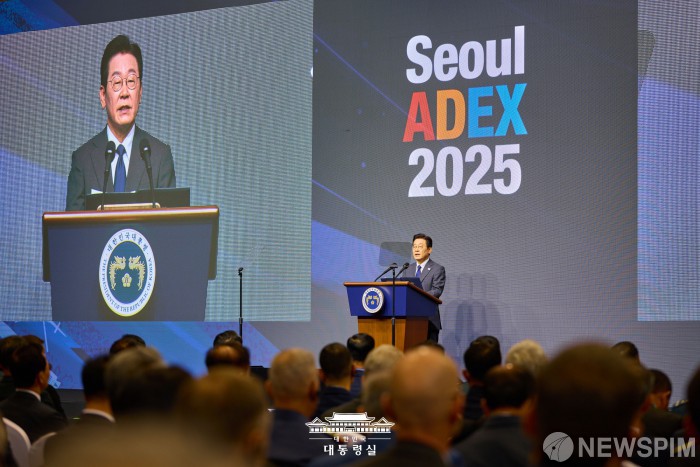 [서울=뉴스핌] 이재명 대통령이 20일 경기 고양시 일산서구 킨텍스에서 열린 서울 ADEX 2025(서울 국제 항공우주 및 방위산업 전시회 2025) 개막식에서 축사를 하고 있다. [사진=대통령실] 2025.10.20 photo@newspim.com