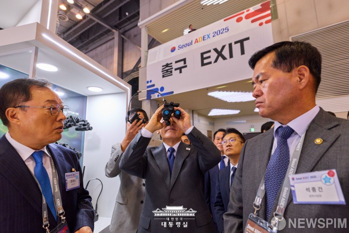 [서울=뉴스핌] 이재명 대통령이 20일 경기 고양시 일산서구 킨텍스에서 열린 서울 ADEX 2025(서울 국제 항공우주 및 방위산업 전시회 2025)에서 전시장을 둘러보고 있다. [사진=대통령실] 2025.10.20 photo@newspim.com