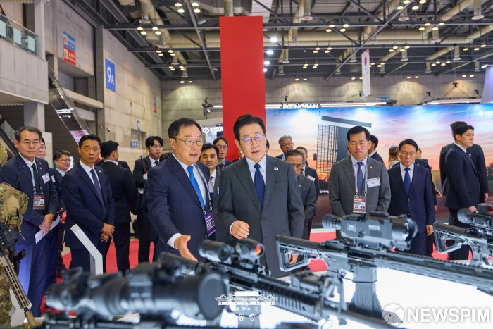 [서울=뉴스핌] 이재명 대통령이 20일 경기 고양시 일산서구 킨텍스에서 열린 서울 ADEX 2025(서울 국제 항공우주 및 방위산업 전시회 2025)에서 전시장을 둘러보고 있다. [사진=대통령실] 2025.10.20 photo@newspim.com