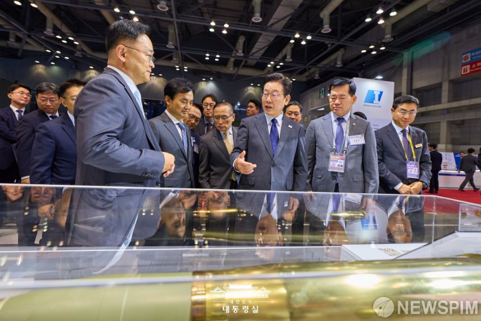 [서울=뉴스핌] 이재명 대통령이 20일 경기 고양시 일산서구 킨텍스에서 열린 서울 ADEX 2025(서울 국제 항공우주 및 방위산업 전시회 2025)에서 전시장을 둘러보고 있다. [사진=대통령실] 2025.10.20 photo@newspim.com