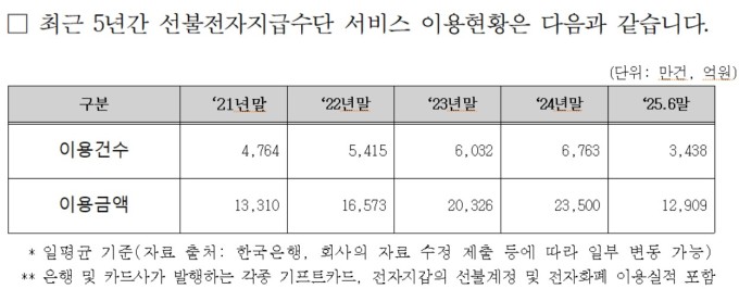 하루 평균 이용건수(단위: 만 건)는 ▲2021년 4764에서 ▲2022년 5415 ▲2023년 6032 ▲2024년 6763 ▲2025년 상반기 3438을 기록했다. 하루 평균 이용금액(단위: 억 원)은 ▲2021년 1만3310에서 ▲2022년 1만6573 ▲2023년 2만326 ▲2024년 2만3500, ▲2025년 상반기 1만2909로 늘었다.