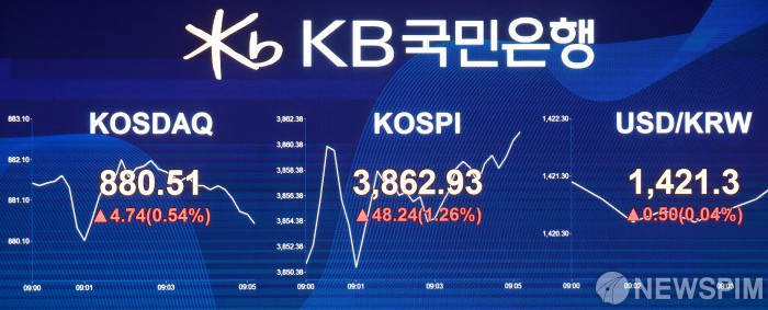 [서울=뉴스핌] 류기찬 기자 = 21일 오전 서울 여의도 KB국민은행 딜링룸 전광판에 코스닥, 코스피, 달러/원 지수가 표시되고 있다. 이날 코스피 지수는 전장 대비 36.32포인트(0.95%) 오른 3851.01에, 코스닥 지수는 5.76포인트(0.66%) 오른 881.53에 장을 시작했다. 달러/원 환율은 전장보다 1.80원 오른 1421.00으로 출발했다. 2025.10.21 ryuchan0925@newspim.com |