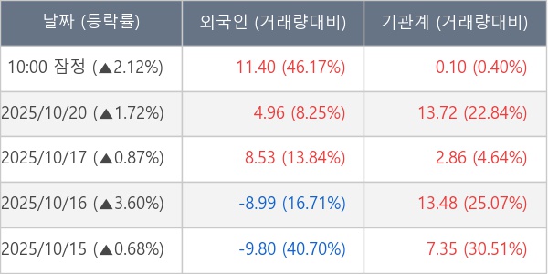 [서울=뉴스핌] 로보뉴스 = 21일 10시 15분 현재 금호타이어(073240)는 전일 대비 2.12% (현재가 4,820원) 상승했고, 기관이 최근 5일 연속 순매수(누적 37.51만 주, 잠정) 행진을 하고 있다.