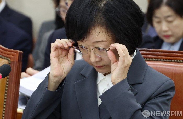 [서울=뉴스핌] 정일구 기자 = 오유경 식품의약품안전처장이 21일 서울 여의도 국회 보건복지위원회에서 열린 식품의약품안전처 등에 대한 국정감사에서 안경을 고쳐쓰고 있다. 2025.10.21 mironj19@newspim.com