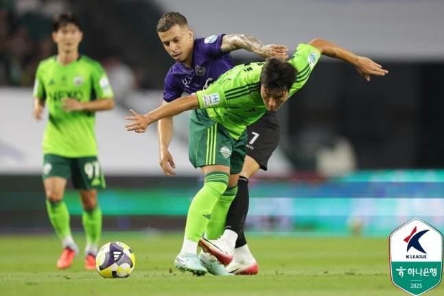 [서울=뉴스핌] 손지호 기자 = 전북 김영빈이 상대 선수와 경합하고 있다. [사진=한국프로축구연맹] 2025.10.21 thswlgh50@newspim.com |