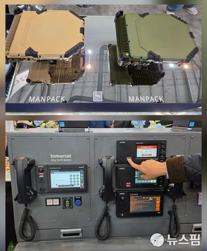 부스 한쪽에는 병사가 배낭에 넣고 이동할 수 있는 초소형 군용 위성 단말 '맨팩(Manpack)'도 전시됐다. 이 장비는 이리듐과 원웹 기반 LEO 위성망을 모두 수신하며, 크기 458×358×108mm, 무게 약 9kg으로 야전 휴대가 가능한 것이 특징이다. 최대 다운로드 속도는 57~70Mbps, 업로드는 10Mbps 수준으로 기존 위성전화보다 100배 이상 빠르며, 방수·방진(IP67), 영하 30℃~영상 55℃ 환경에서도 작동한다.