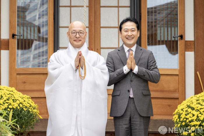 [서울=뉴스핌] 국회사진기자단 = 장동혁 국민의힘 대표와 대한불교조계종 총무원장 진우스님이 21일 오후 서울 강남구 봉은사에서 합장을 하고 기념촬영을 하고 있다. 2025.10.21 photo@newspim.com