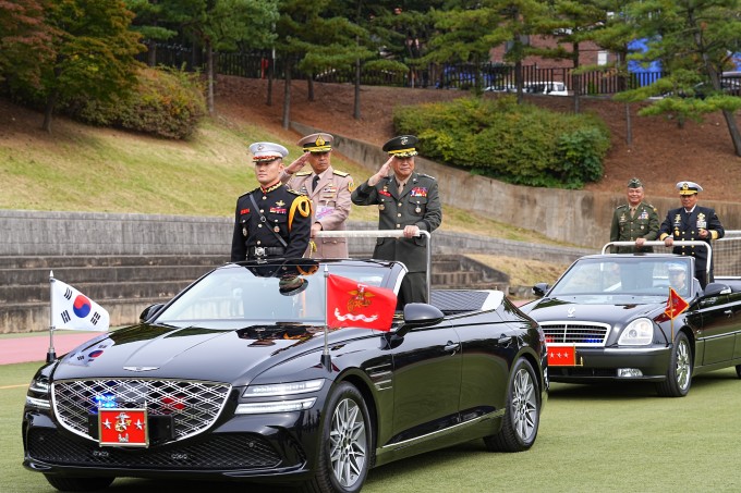 21일 해병대사령부 연병장에서 주일석 사령관과 태국, 인니, 필리핀 해병대사령관이 열병을 실시하고 있다. [사진=해병대사령부 제공] 2025.10.21 gomsi@newspim.com