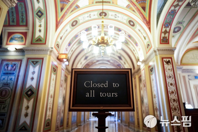 2025년 10월 20일(현지시간) 워싱턴 D.C.의 미 연방의회 의사당 내부에 미국 정부 셧다운이 몇 주째 이어지는 가운데, 의회 투어 중단을 알리는 안내문이 게시되어 있다. [사진=로이터 뉴스핌] |