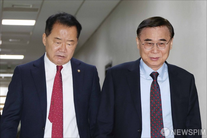[서울=뉴스핌] 윤창빈 기자 = 신성범 국회 정보위원회 위원장과 이종석 국가정보원장이 22일 오전 서울 여의도 국회에서 열린 국회 정보위원회 전체회의 시작 전 정보위원장실로 향하고 있다. 2025.10.22 pangbin@newspim.com