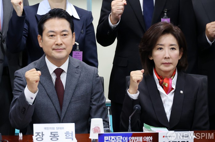 [서울=뉴스핌] 정일구 기자 = 장동혁 국민의힘 대표와 나경원 의원이 22일 오전 서울 여의도 국회 의원회관에서 열린 민주당의 입법에 의한 사법침탈 긴급 토론회에서 기념촬영을 하고 있다. 2025.10.22 mironj19@newspim.com