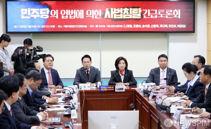 [서울=뉴스핌] 정일구 기자 = 장동혁 국민의힘 대표가 22일 오전 서울 여의도 국회 의원회관에서 열린 민주당의 입법에 의한 사법침탈 긴급 토론회에서 인사말을 하고 있다. 2025.10.22 mironj19@newspim.com