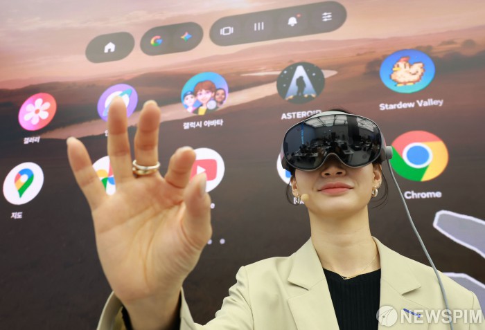 [서울=뉴스핌] 김학선 기자 = 삼성전자가 22일 오전 서울 서초구 삼성 강남에서 구글과 공동 개발한 확장현실(XR) 헤드셋 '갤럭시 XR' 미디어 공개행사를 열었다. 관계자가 '갤럭시 XR'을 시연하고 있다. 2025.10.22 yooksa@newspim.com |