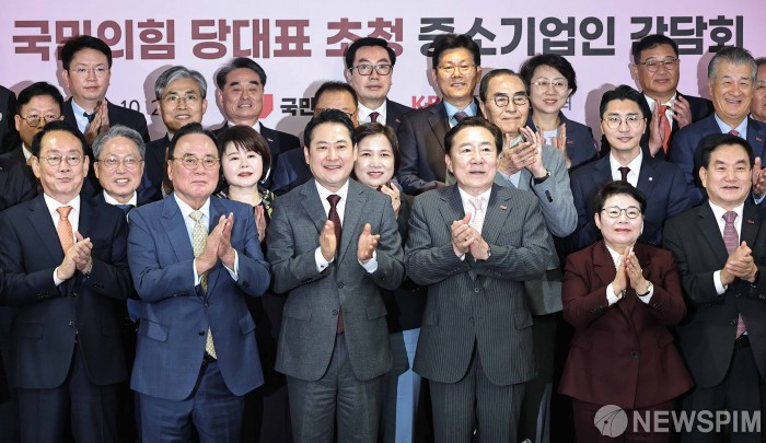 [서울=뉴스핌] 윤창빈 기자 = 장동혁 국민의힘 대표, 김기문 중소기업중앙회장 등 참석자들이 22일 오후 서울 여의도 중소기업중앙회에서 열린 중소기업인 간담회에서 기념촬영을 하고 있다. 2025.10.22 pangbin@newspim.com