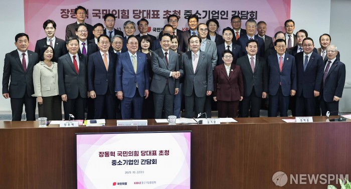 [서울=뉴스핌] 윤창빈 기자 = 장동혁 국민의힘 대표, 김기문 중소기업중앙회장 등 참석자들이 22일 오후 서울 여의도 중소기업중앙회에서 열린 중소기업인 간담회에서 기념촬영을 하고 있다. 2025.10.22 pangbin@newspim.com