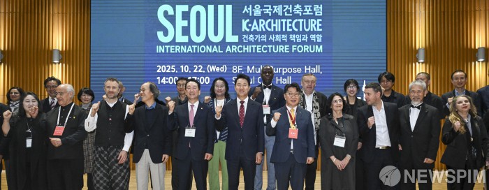 [서울=뉴스핌] 양윤모 기자 = 오세훈 서울시장이 22일 오후 서울시청 다목적홀에서 열린 '서울국제건축포럼'에서 참석자들과 기념촬영을 하고 있다. 서울시는 K-건축의 우수성을 세계에 알리고 건축가들의 글로벌 역량을 강화하기 위해 세계 건축 석학과 신진 건축가들이 한자리에 모여 미래 도시건축의 비전을 공유하는 이번 포럼을 개최했다. 2025.10.22 yym58@newspim.com