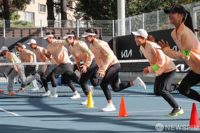 [서울=뉴스핌] 22일 서울 워커힐 테네즈 파크에서 열린 ‘The Road Ahead – 기아 주니어 테니스 프로그램’에 참가한 한국 테니스 유망주 선수들이 라파 나달 아카데미 코치진으로부터 국제 기준의 훈련법을 배우고 있다.[사진=기아] 2025.10.22 photo@newspim.com