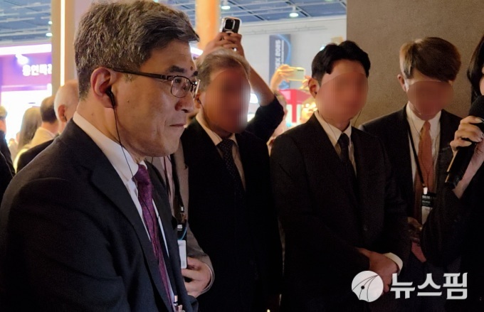 [서울=뉴스핌] 김아영 기자 = 송재혁 삼성전자 DS(반도체)부문 최고기술책임자(CTO)가 22일 서울 강남구 코엑스에서 열린 '제27회 반도체대전(SEDEX 2025)'에 참석해 SK하이닉스 부스의 HBM4 실물을 주의깊게 보고 있다. 2025.10.22 aykim@newspim.com |