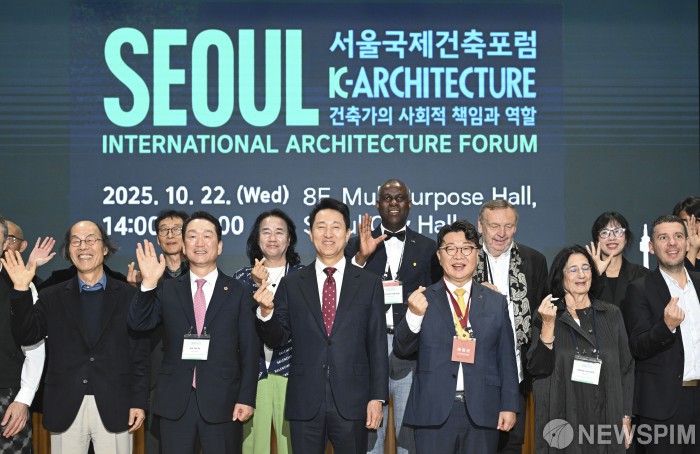 [서울=뉴스핌] 양윤모 기자 = 오세훈 서울시장이 22일 오후 서울시청 다목적홀에서 열린 '서울국제건축포럼'에서 참석자들과 기념촬영을 하고 있다. 서울시는 K-건축의 우수성을 세계에 알리고 건축가들의 글로벌 역량을 강화하기 위해 세계 건축 석학과 신진 건축가들이 한자리에 모여 미래 도시건축의 비전을 공유하는 이번 포럼을 개최했다. 2025.10.22 yym58@newspim.com