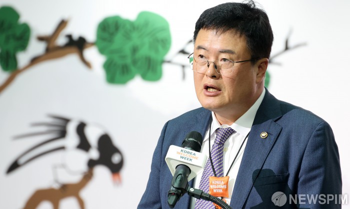 [영종도=뉴스핌] 최지환 기자 = 김대현 문화체육관광부 차관이 23일 오전 인천국제공항 제1여객터미널에서 열린 2025 환영주간 개막행사에서 인사말을 하고 있다. 2025.10.23 choipix16@newspim.com