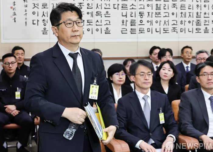 [서울=뉴스핌] 윤창빈 기자 = 문지석 광주지검 부장검사가 23일 오전 서울 여의도 국회에서 열린 법제사법위원회의 서울고등검찰청 등에 대한 국정감사에서 답변을 위해 발언대로 향하고 있다. 2025.10.23 pangbin@newspim.com