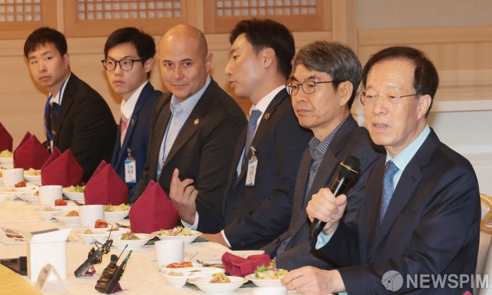 [서울=뉴스핌] 이길동 기자 =이석연 국민통합위원장이 23일 서울 종로구 정부서울청사에서 열린 미주한인상공회의소총연합회 차세대그룹과의 오찬간담회에서 인사말을 하고 있다.2025.10.23 gdlee@newspim.com