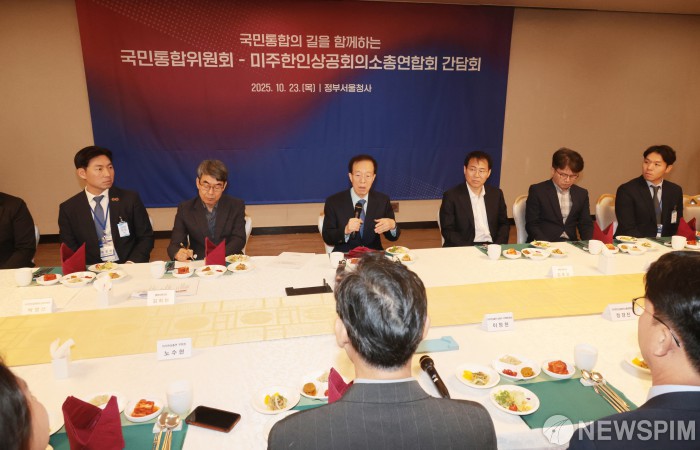 [서울=뉴스핌] 이길동 기자 =이석연 국민통합위원장이 23일 서울 종로구 정부서울청사에서 열린 미주한인상공회의소총연합회 차세대그룹과의 간담회에서 인사말을 하고 있다.2025.10.23 gdlee@newspim.com