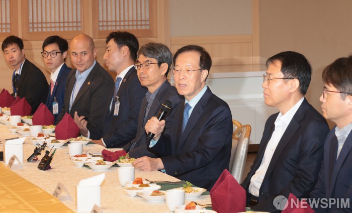 [서울=뉴스핌] 이길동 기자 =이석연 국민통합위원장이 23일 서울 종로구 정부서울청사에서 열린 미주한인상공회의소총연합회 차세대그룹과의 간담회에서 인사말을 하고 있다.2025.10.23 gdlee@newspim.com
