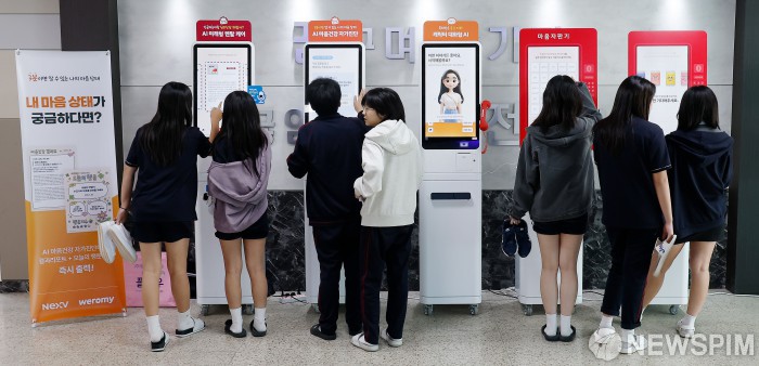 [용인=뉴스핌] 류기찬 기자 = 구성중학교 재학생들이 23일 오후 경기 용인시 기흥구 구성중학교에서 열린 '2025 경기도교육청 찾아가는 생명존중 캠페인'에서 AI 기반 마음상담 기기 '위로미'를 체험하고 있다. 2025.10.23 ryuchan0925@newspim.com