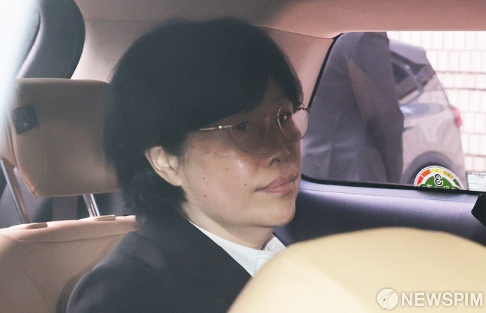 [서울=뉴스핌] 양윤모 기자 = 채상병 순직 및 수사 외압·은폐 의혹의 피의자인 유재은 전 국방부 법무관리관 23일 오후 서울 서초구 서울중앙지법에 열린 구속 전 피의자 심문(영장실질심사)을 마치고 호송차에 참승후 대기장소로 이동하고 있다. 2025.10.23 yym58@newspim.com