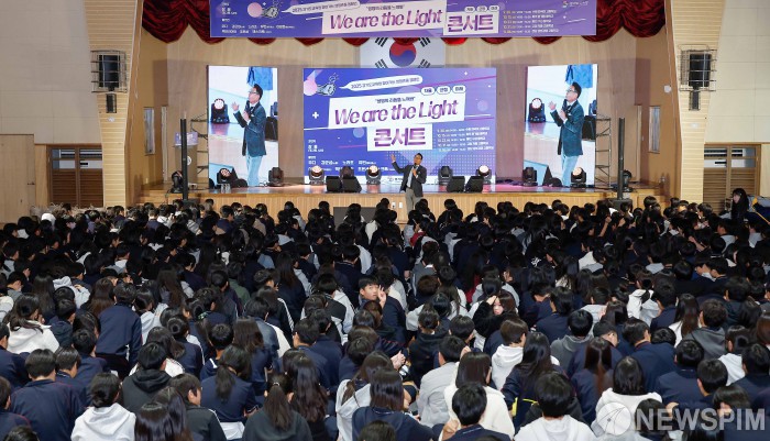 [용인=뉴스핌] 류기찬 기자 = 개그맨 장용이 23일 오후 경기 용인시 기흥구 구성중학교에서 열린 '2025 경기도교육청 찾아가는 생명존중 캠페인'에서 사회를 맡고 있다. 2025.10.23 ryuchan0925@newspim.com