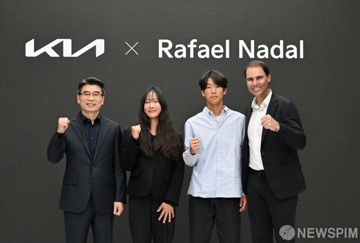 [서울=뉴스핌]기아는 세계적인 테니스 선수 라파엘 나달과 글로벌 파트너십 연장 계약을 체결했다고 23일 밝혔다. '앞으로의 여정(The Road Ahead)'이라는 콘셉트의 행사를 통해 12년 만에 방한한 나달이 국내 테니스 유망주와 팬들을 직접 만나 테니스에 대한 열정과 노하우 등을 함께 나누는 뜻깊은 자리를 마련했다.이날 글로벌 파트너십 연장 협약식에서 참석한 기아 송호성 사장(왼쪽)과 라파엘 나달이 기아 주니어 테니스 프로그램에서 선발된 유망주 선수들과 기념사진을 찍고 있다.[사진=기아] 2025.10.23 photo@newspim.com