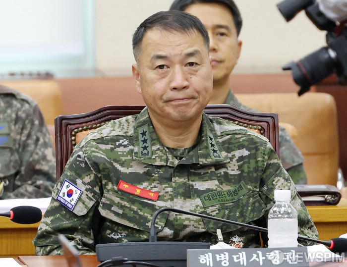 [서울=뉴스핌] 정일구 기자 = 주일석 해병대사령관이 29일 오후 서울 여의도 국회에서 열린 국방위원회 전체회의에서 현안보고를 위해 출석해 있다. 2025.09.29 mironj19@newspim.com