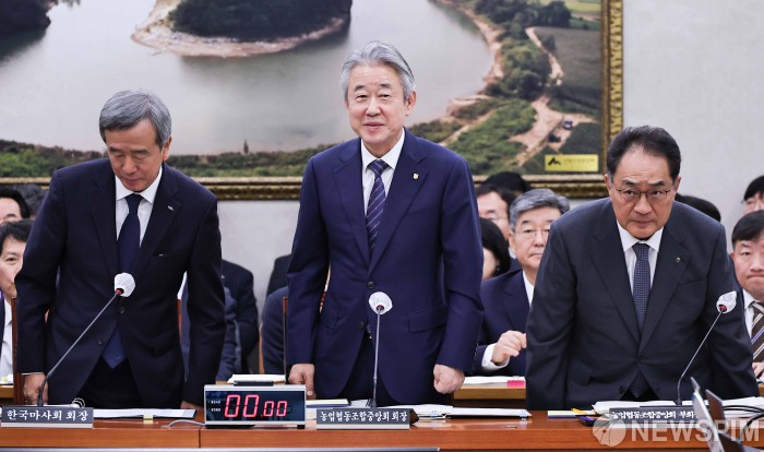 [서울=뉴스핌] 윤창빈 기자 = 정기환 한국마사회장(왼쪽부터), 강호동 농업협동조합중앙회장, 지준섭 농업협동조합중앙회 부회장이 24일 오전 서울 여의도 국회에서 열린 농림축산해양수산위원회의 농업협동조합중앙회 등에 대한 국정감사에 출석하고 있다. 2025.10.24 pangbin@newspim.com