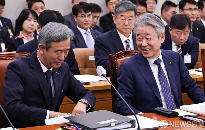 [서울=뉴스핌] 윤창빈 기자 = 강호동 농업협동조합중앙회장, 정기환 한국마사회장이 24일 오전 서울 여의도 국회에서 열린 농림축산해양수산위원회의 농업협동조합중앙회 등에 대한 국정감사에서 대화를 나누고 있다. 2025.10.24 pangbin@newspim.com