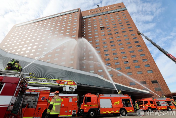 [서울=뉴스핌] 김학선 기자 = 24일 오전 서울 중구 신라호텔에서 열린 '2025 안전한국훈련'에서 소방대원들이 고가사다리차와 소방차를 동원해 화재 진압 및 인명 구조 훈련을 실시하고 있다. 이번 훈련은 호텔 주방에서 음식 조리 중에 화재가 발생한 상황을 가정해 진행됐다. 2025.10.24 yooksa@newspim.com