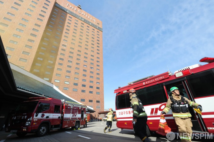 [서울=뉴스핌] 김학선 기자 = 24일 오전 서울 중구 신라호텔에서 열린 '2025 안전한국훈련'에서 소방대원들이 화재 진압 훈련을 하고 있다. 이번 훈련은 호텔 주방에서 음식 조리 중에 화재가 발생한 상황을 가정해 진행됐다. 2025.10.24 yooksa@newspim.com