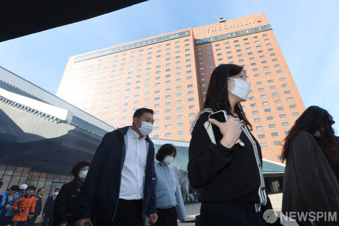 [서울=뉴스핌] 김학선 기자 = 24일 오전 서울 중구 신라호텔에서 열린 '2025 안전한국훈련'에서 투숙객들이 대피 훈련을 하고 있다. 이번 훈련은 호텔 주방에서 음식 조리 중에 화재가 발생한 상황을 가정해 진행됐다. 2025.10.24 yooksa@newspim.com