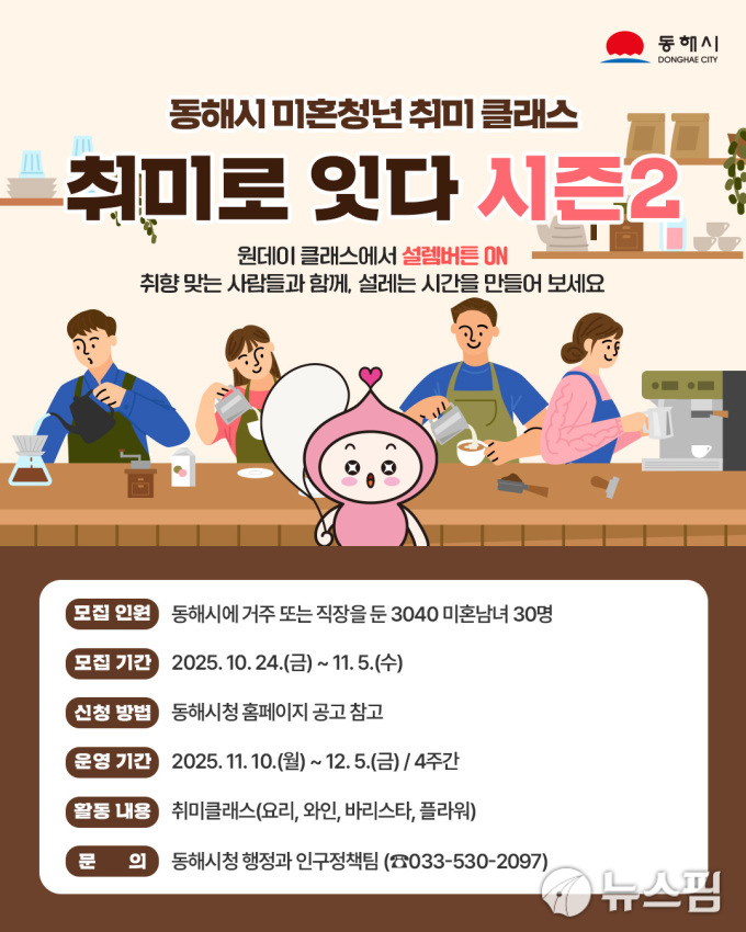 [동해=뉴스핌] 이형섭 기자 = 강원 동해시가 지역 미혼 청년을 위한 취미클래스 '취미로 잇다-시즌2' 참가자를 선착순으로 모집한다.