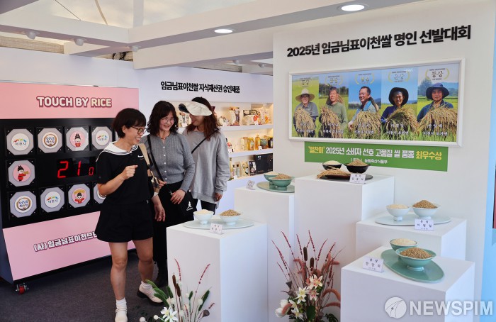[서울=뉴스핌] 양윤모 기자 =24일 오후 경기도 이천시 이천농업테마공원에서 열린 '제24회 이천쌀문화축제'를 찾은 방문객들이 임금님표 이천쌀 전시부스를 돌아보고 있다. '맛과 멋이 어우러진, 쌀로 잇는 즐거움'이란 주제로 열리는 올해 축제는 다양한 참여 및 체험 행사와 전통 공연 등으로 26일까지 열린다. [사진=이천시청] 2025.10.24 yym58@newspim.com