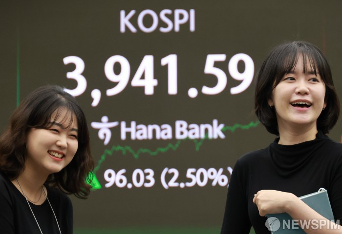 [서울=뉴스핌] 김학선 기자 = 미·중 정상회담 확정에 코스피가 3900선을 돌파한 24일 오후 코스피 지수는 전 거래일 대비 96.03p(2.50%) 오른 3941.59에 장을 마쳤다. 이날 오후 서울 중구 하나은행 딜링룸 전광판에 종가가 표시되고 있다. 2025.10.24 yooksa@newspim.com