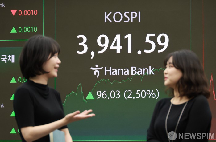 [서울=뉴스핌] 김학선 기자 = 미·중 정상회담 확정에 코스피가 3900선을 돌파한 24일 오후 코스피 지수는 전 거래일 대비 96.03p(2.50%) 오른 3941.59에 장을 마쳤다. 이날 오후 서울 중구 하나은행 딜링룸 전광판에 종가가 표시되고 있다. 2025.10.24 yooksa@newspim.com